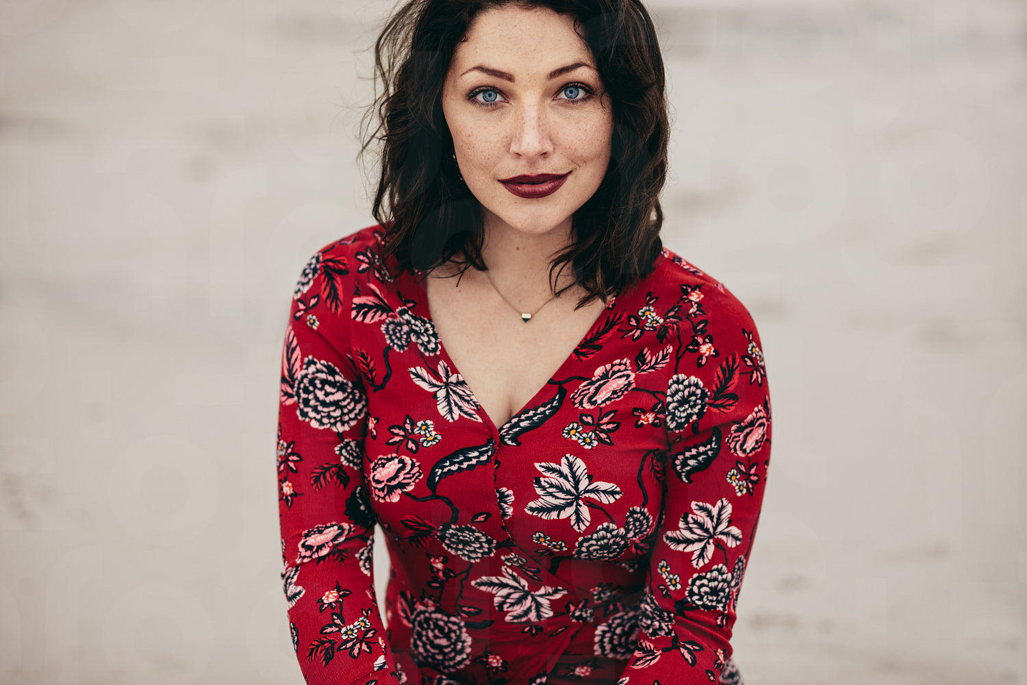Portrait of attractive young woman looking at the camera with confidence. Beautiful female model posing confidently in red dress outdoors.