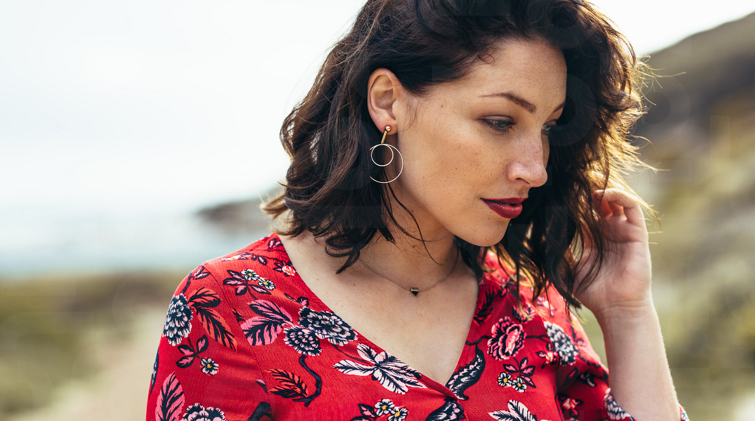 Close up of beautiful woman standing outdoors looking down. Female in red dress with blank expression on her face.