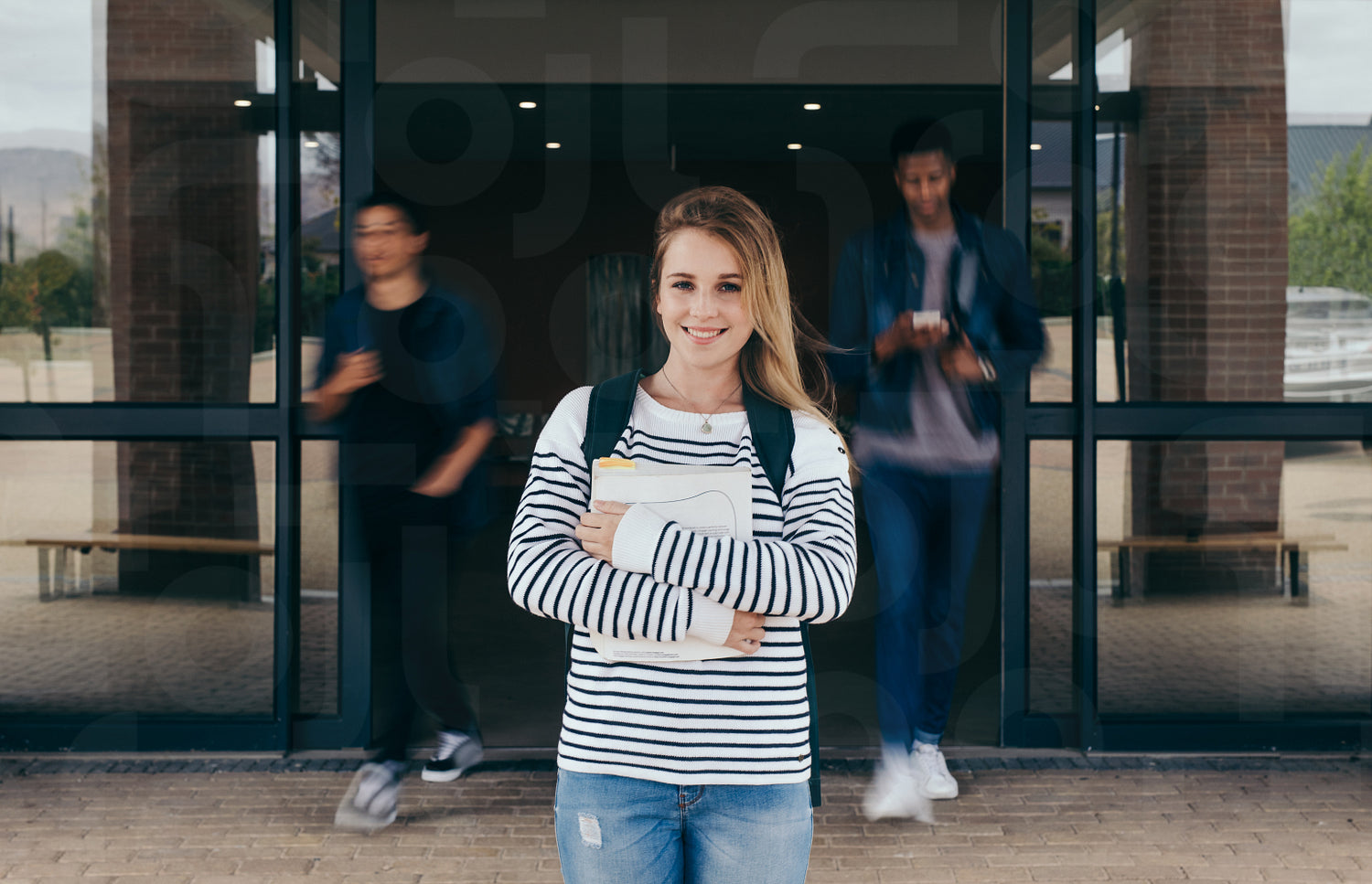 Confident female student standing at university campus with other students walking in background. Young woman standing in college with students walking at the back in motion blur.