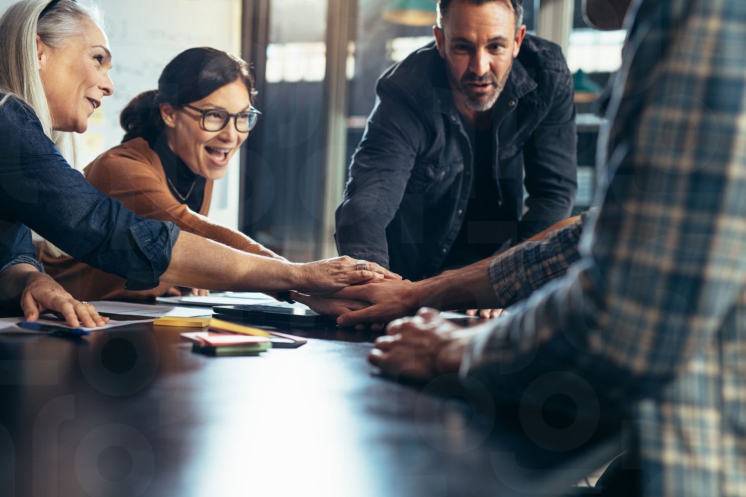 Group of business people stacking their hands over table. Positive business team putting their hands on top of each other, showing unity and teamwork.