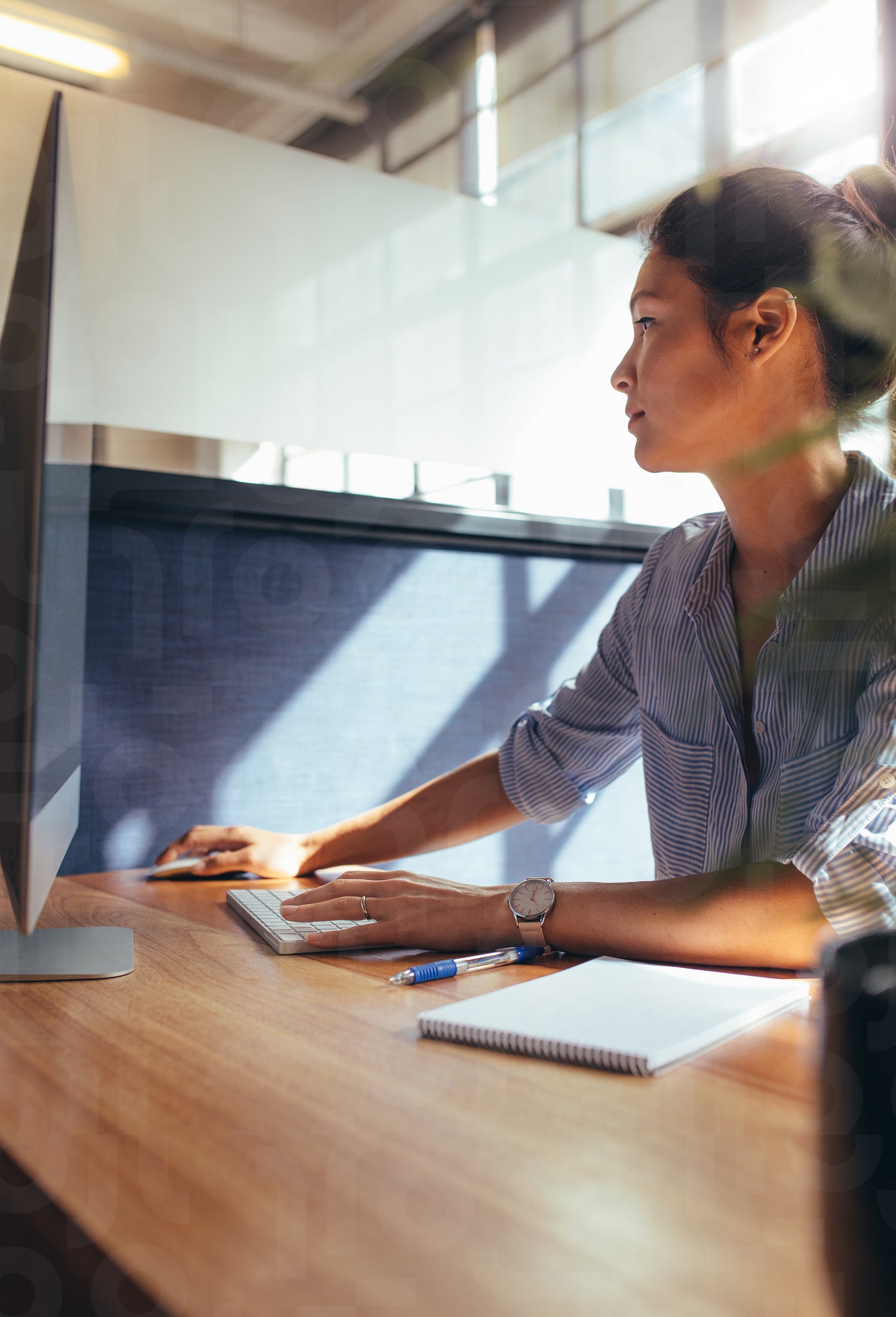 Asian woman working at her desk in office. Young professional female working on desktop computer.