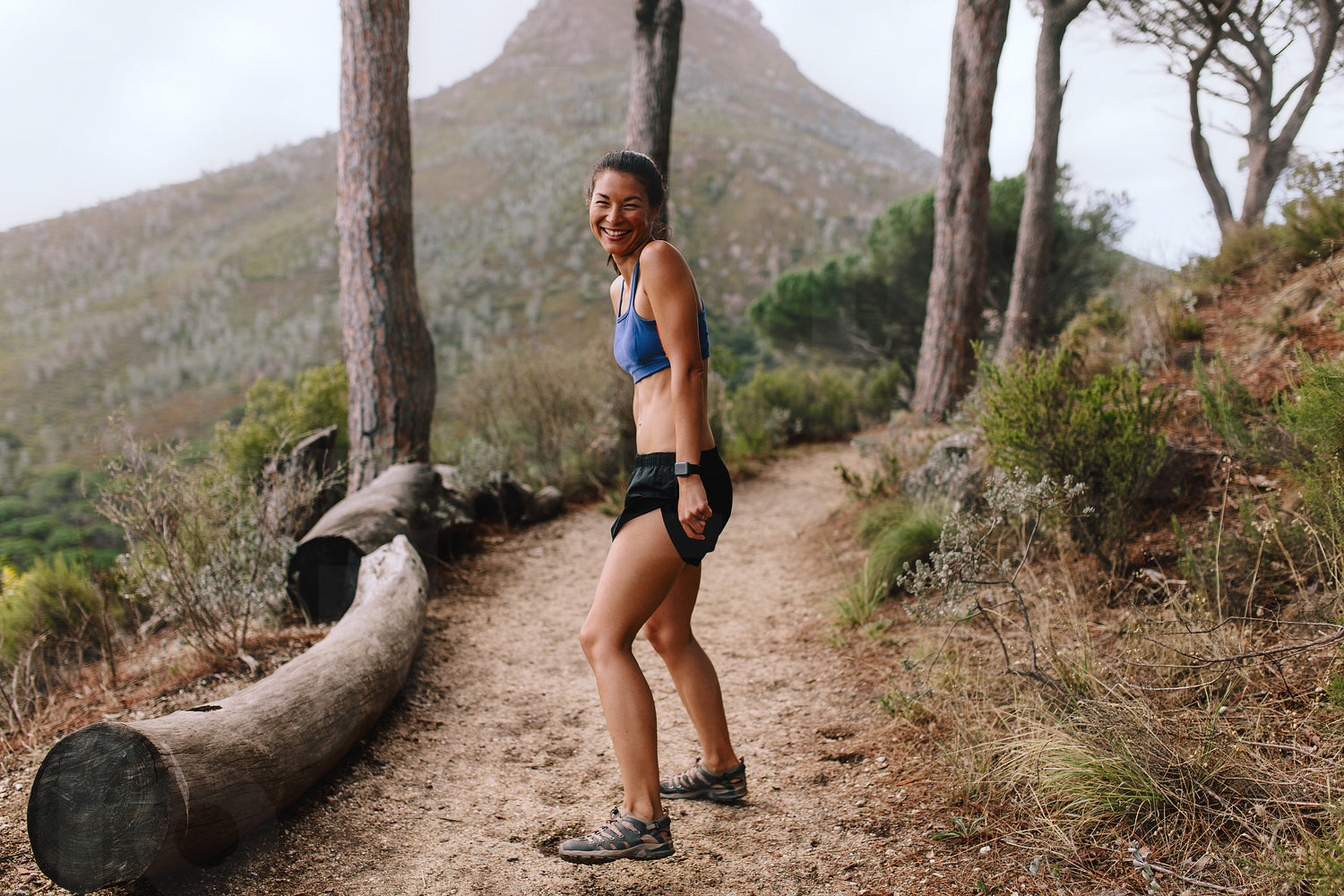 Full length shot of happy young asian woman standing on mountain trail and smiling. Fitness woman in sportswear on cross country path.