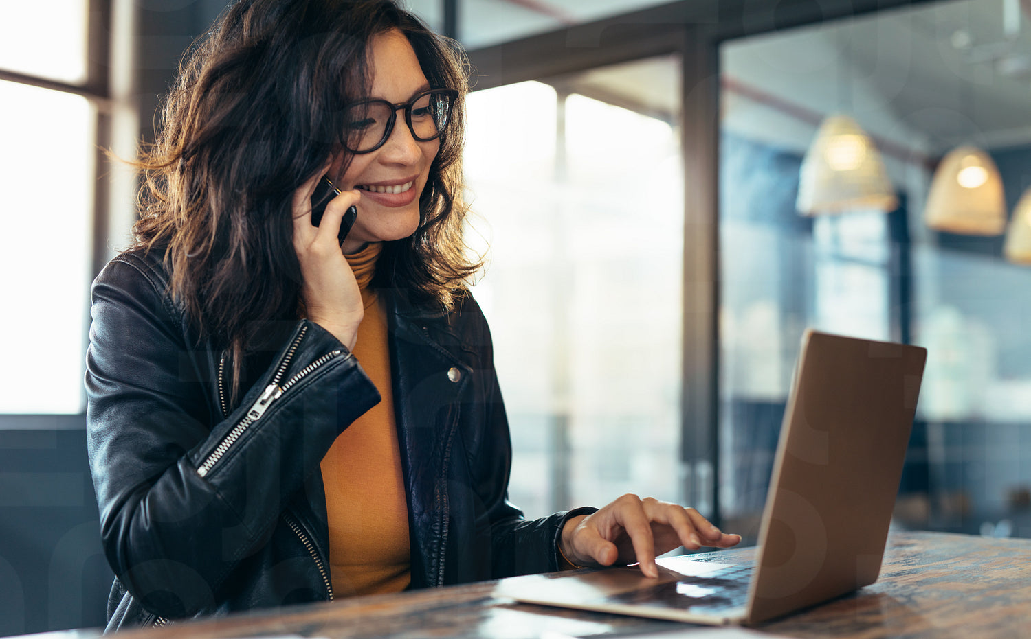 Happy business woman working at the desk. Female talking on cell phone and working on laptop.