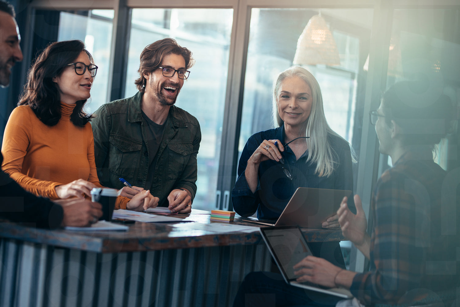 Happy group of people having meeting in office. Young man laughing during meeting with coworkers standing around.