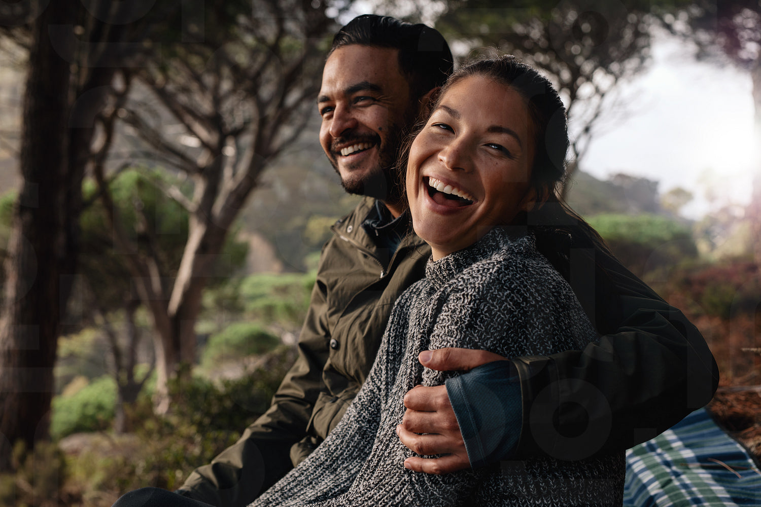 Young asian woman sitting outdoors with her boyfriend and smiling. Young hiker couple resting after hike.