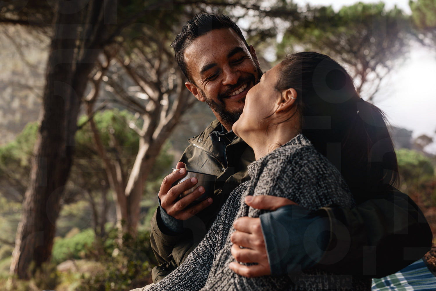 Loving young couple camping in forest and having coffee. Young man and woman sitting together outdoors and smiling.