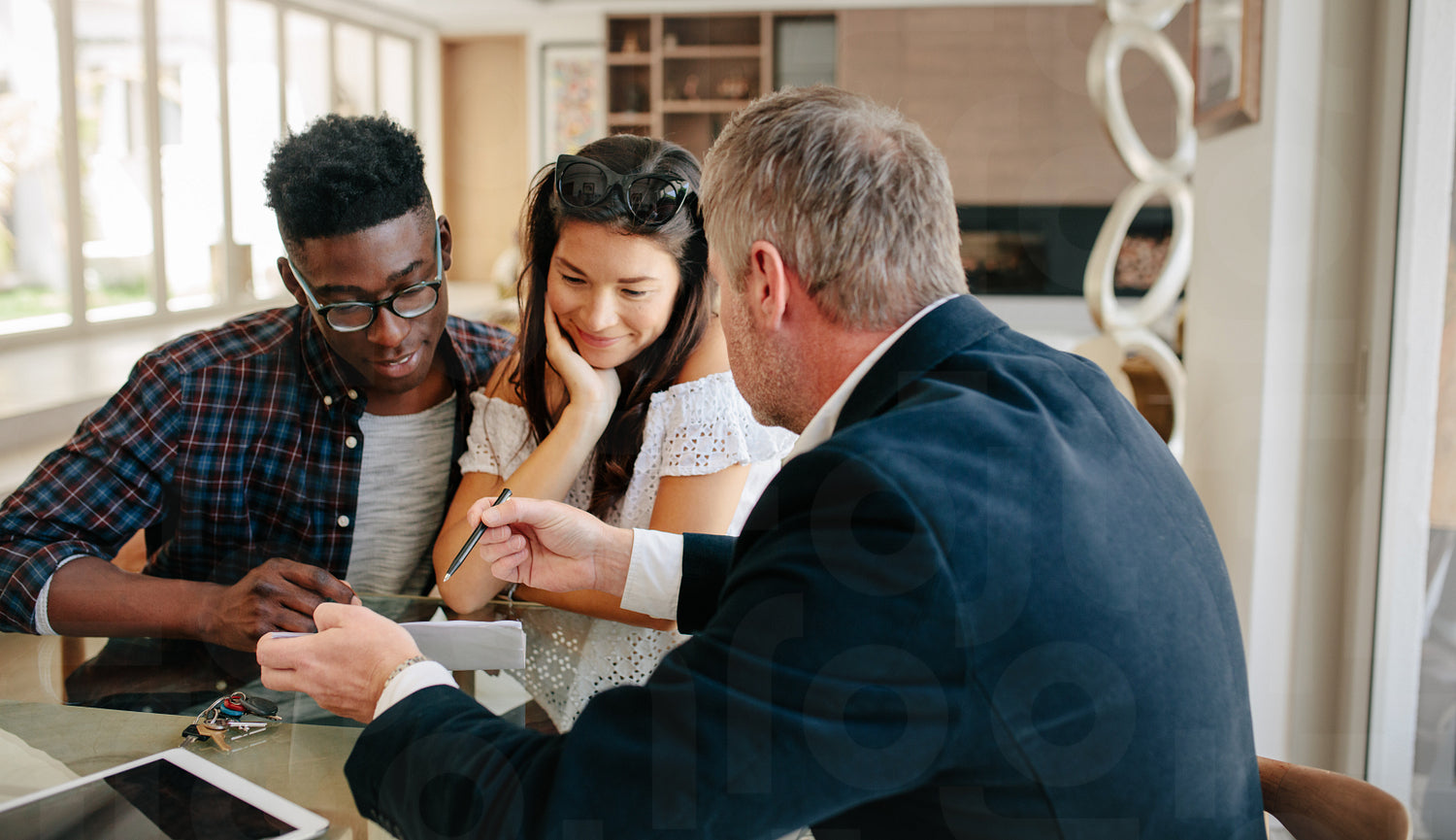 Real estate agent showing detail of lease agreement to interracial couple. Estate broker explaining lease agreement or purchase contract to couple in a new house.
