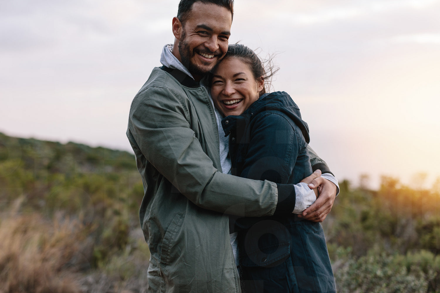 Smiling young couple in love embracing in nature. Romantic young man and woman in countryside.