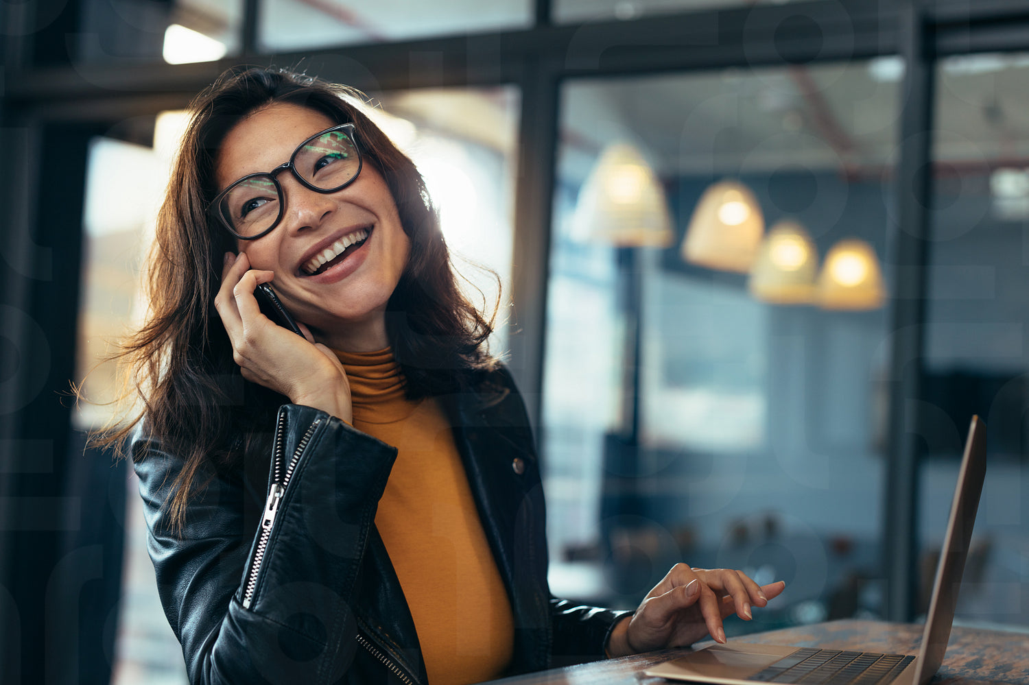 Cheerful asian female talking on mobile phone while sitting on desk with laptop. Business woman in casuals making a phone call and laughing.