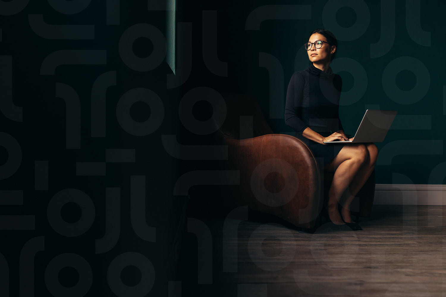 Thoughtful lady sitting on armchair with laptop and looking away. Young woman working on laptop and looking outside window.