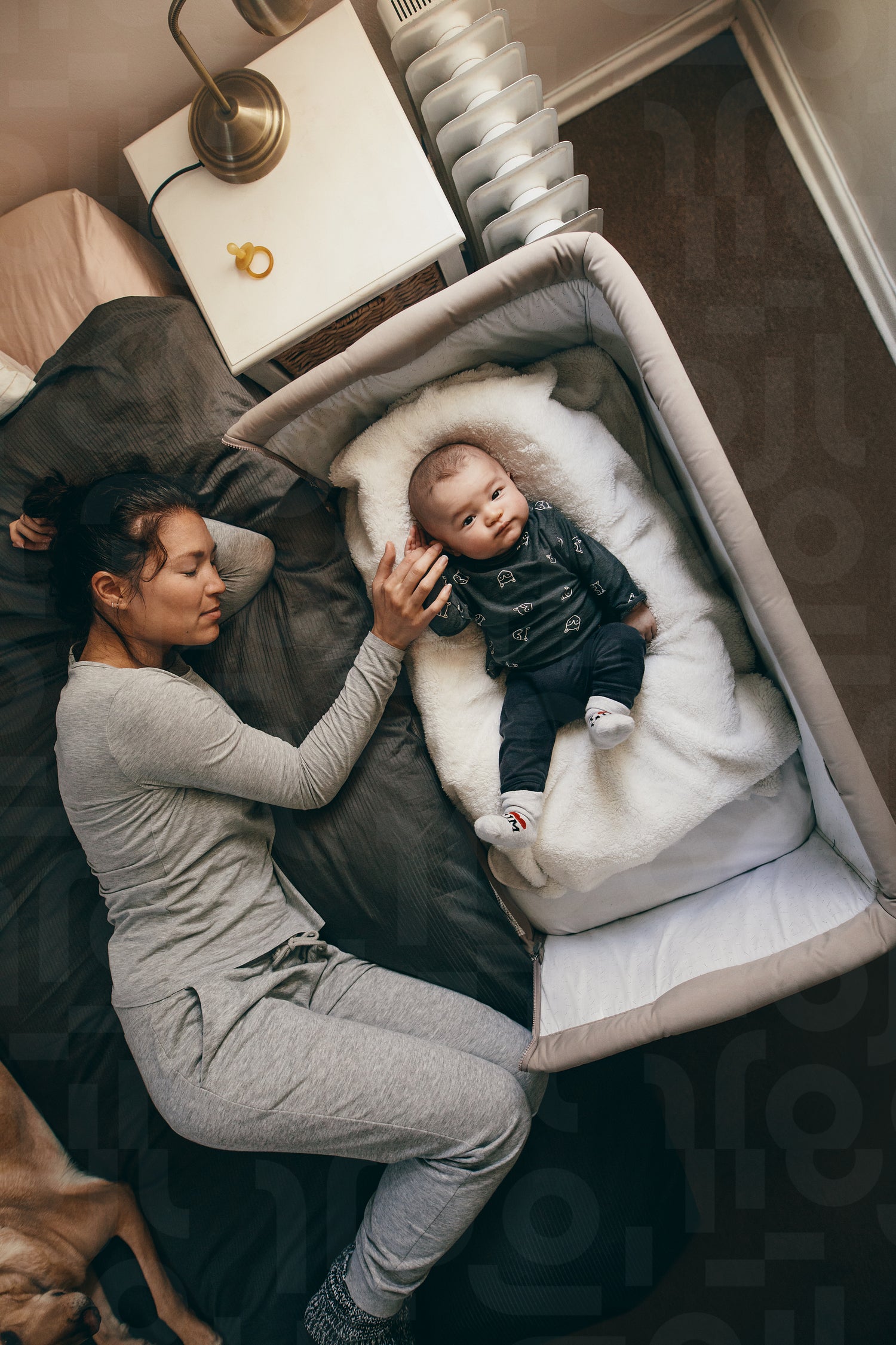 Mother and child sleeping on bed at home. Woman sleeping on bed holding the hand of her baby sleeping in a bedside crib.
