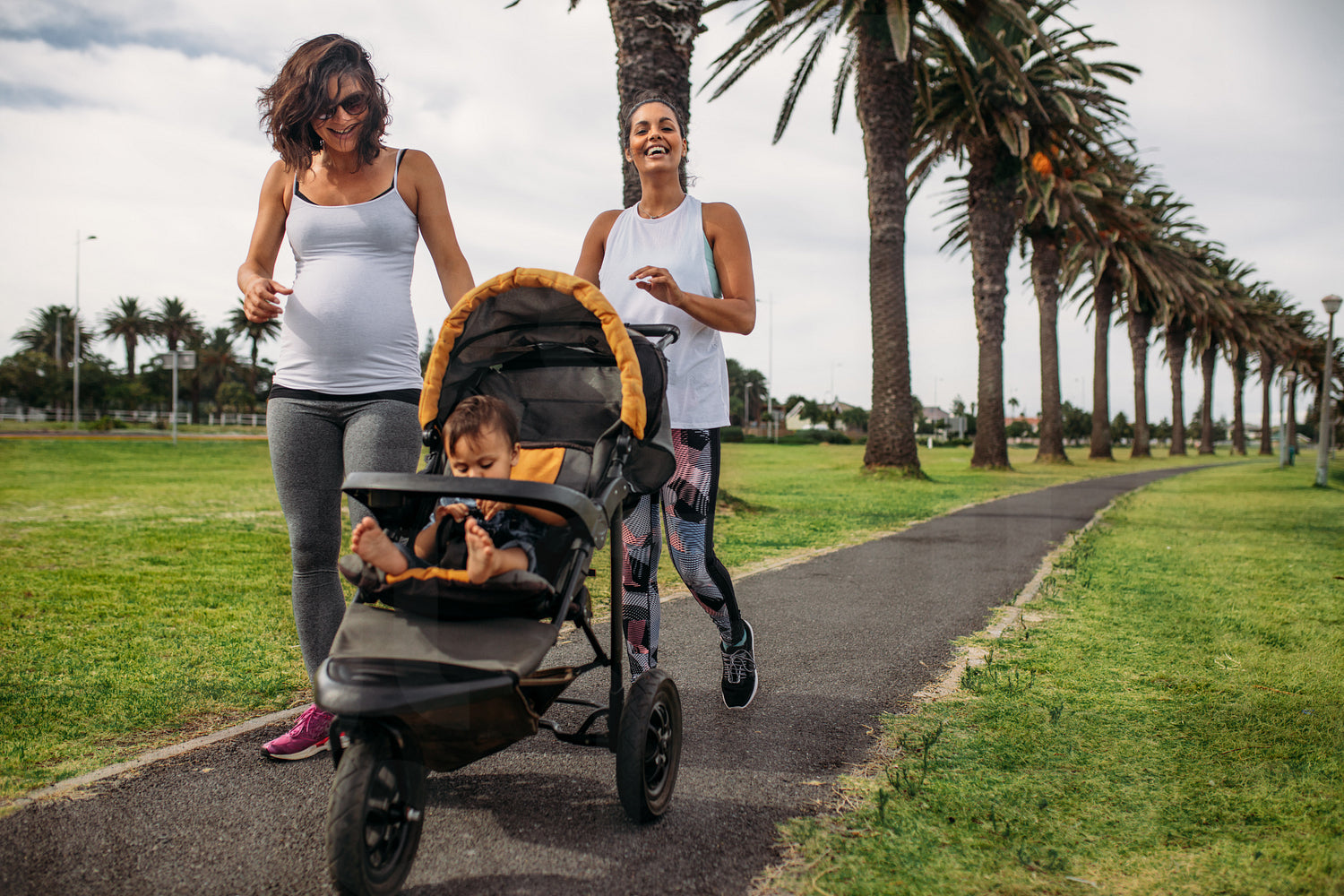 Two women walking with a baby pram in a park. Pregnant woman on a morning walk with her baby in a stroller.