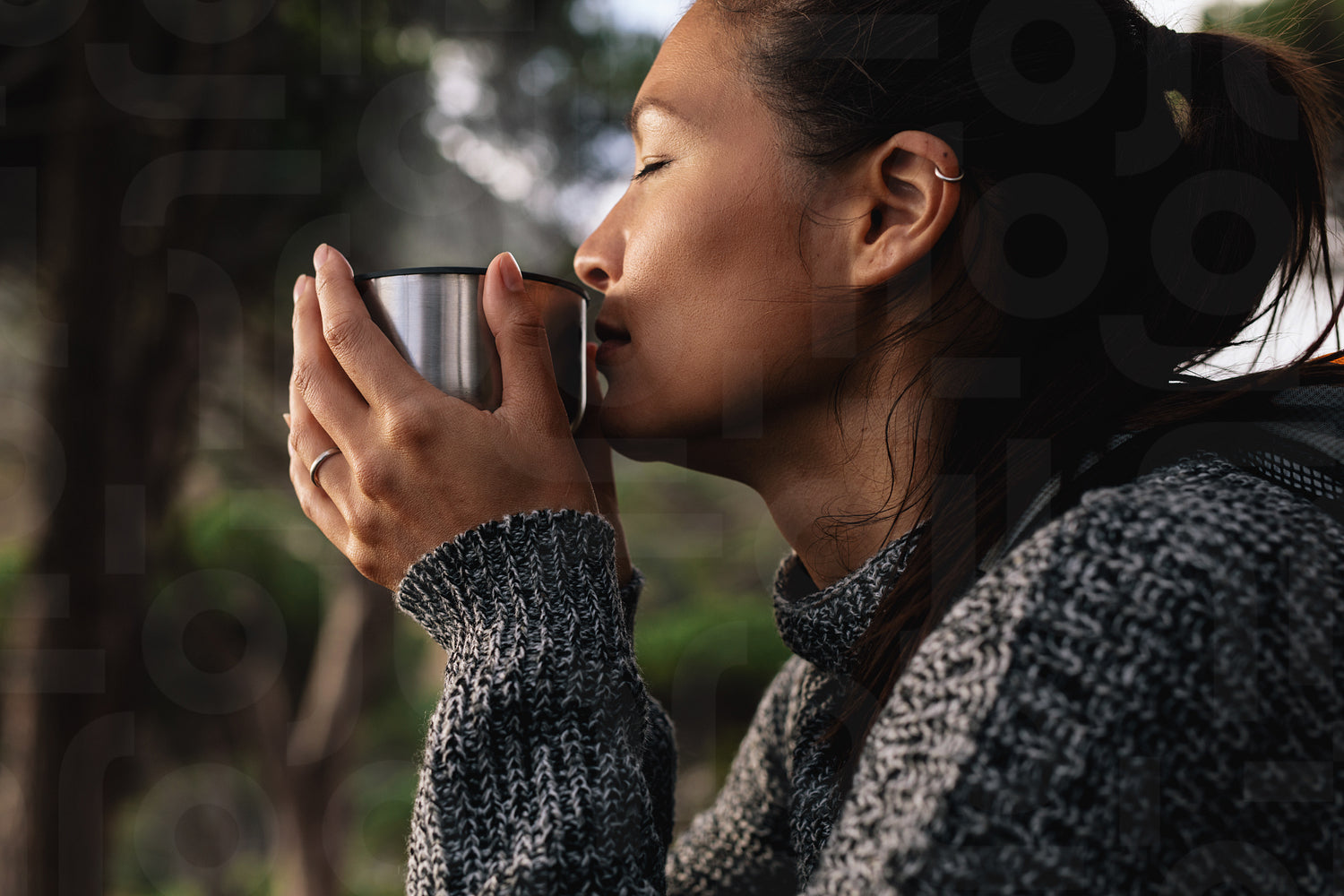 Close up shot of young asian woman having coffee outdoors. Female hiker taking rest and drinking fresh coffee.
