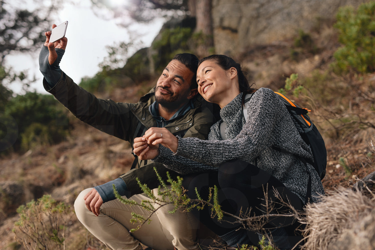 Young couple out on hike in mountains taking selfie with smart phone. Relaxed young man and woman sitting on country path and taking self portrait by mobile phone.