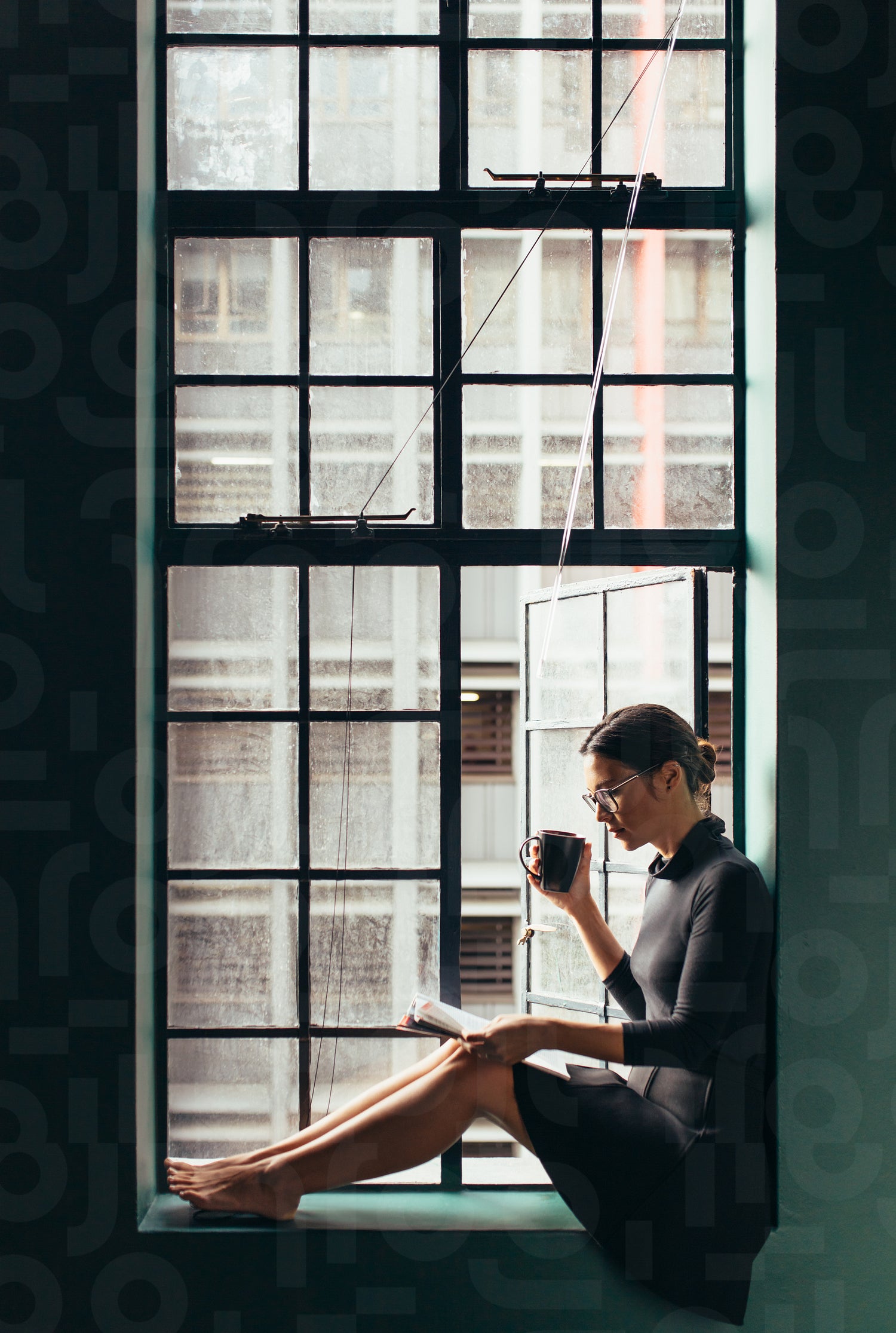 Young woman reading magazine and drinking coffee while sitting on the windowsill. Vertical shot of asian woman indoors with book.