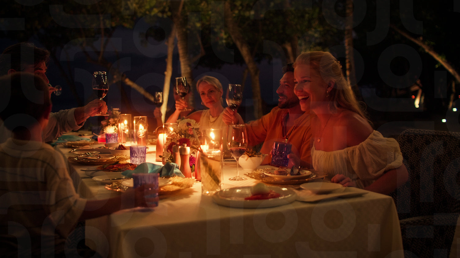 A joyful family and friends group enjoys a delightful candlelit dinner outdoors at an exotic island resort, sharing laughter and creating beautiful memories during their luxury vacation.