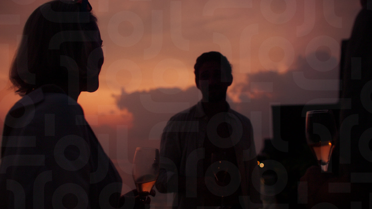 Silhouettes of friends raising champagne flutes against a stunning sunset backdrop. A scene of celebration, happiness, and friendship, perfect for evoking luxury and special occasions.