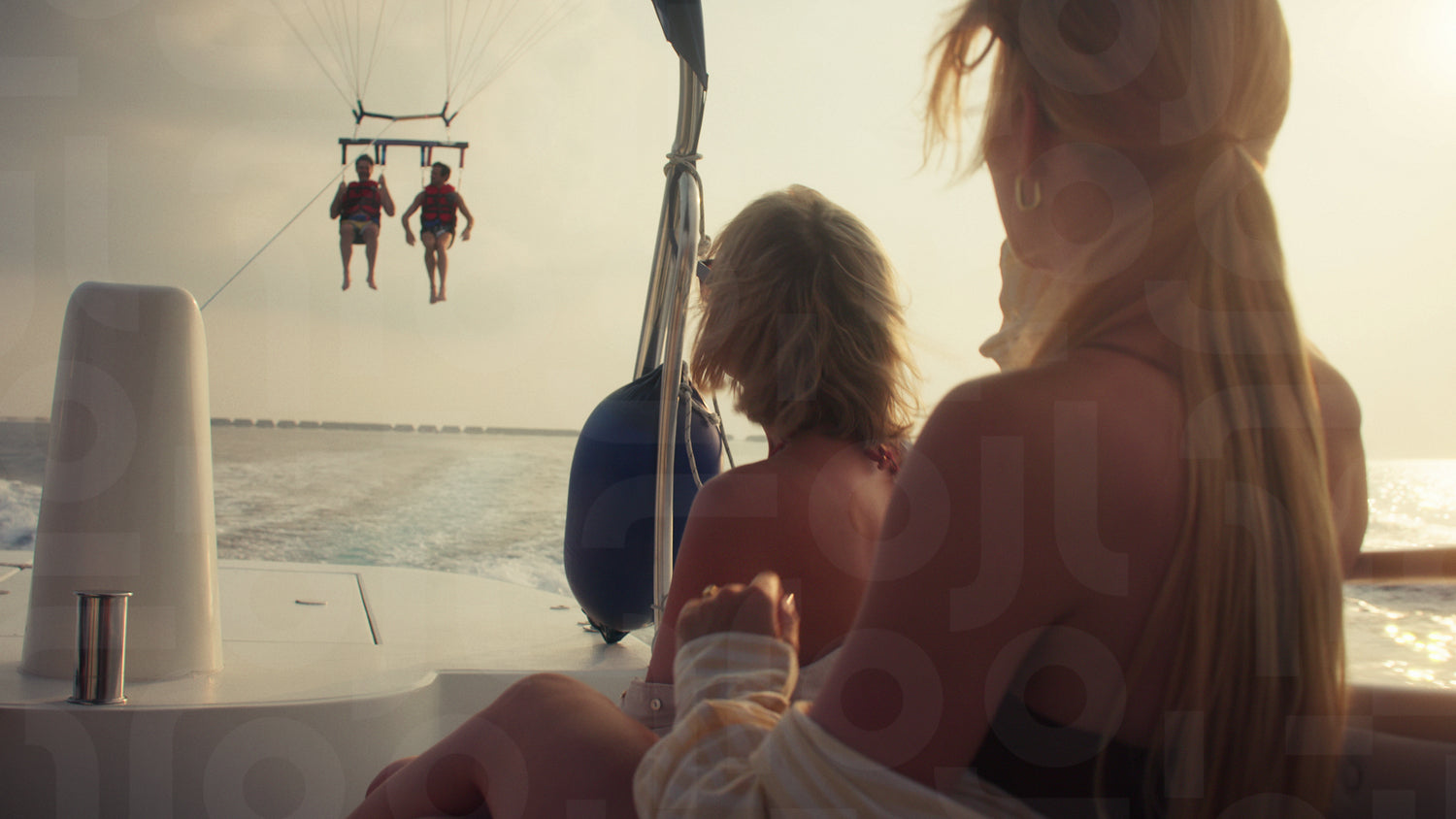 Friends observe two people parasailing high above the water from a boat. The vibrant parachute adds color to the serene sky, creating a memorable vacation moment.