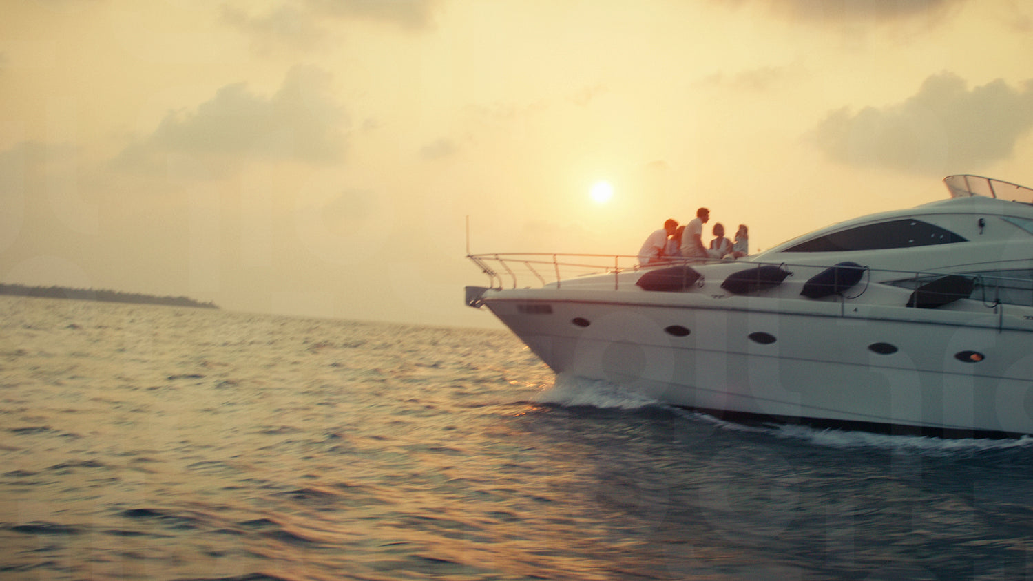Golden sunset illuminates friends on a luxury yacht cruising peacefully on the ocean