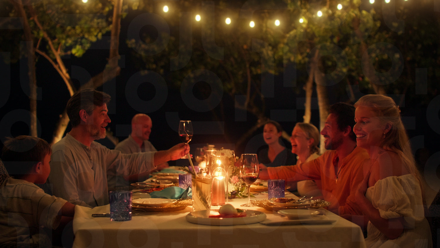 Joyful family and friends enjoying an illuminated outdoor dinner at a beautiful island resort