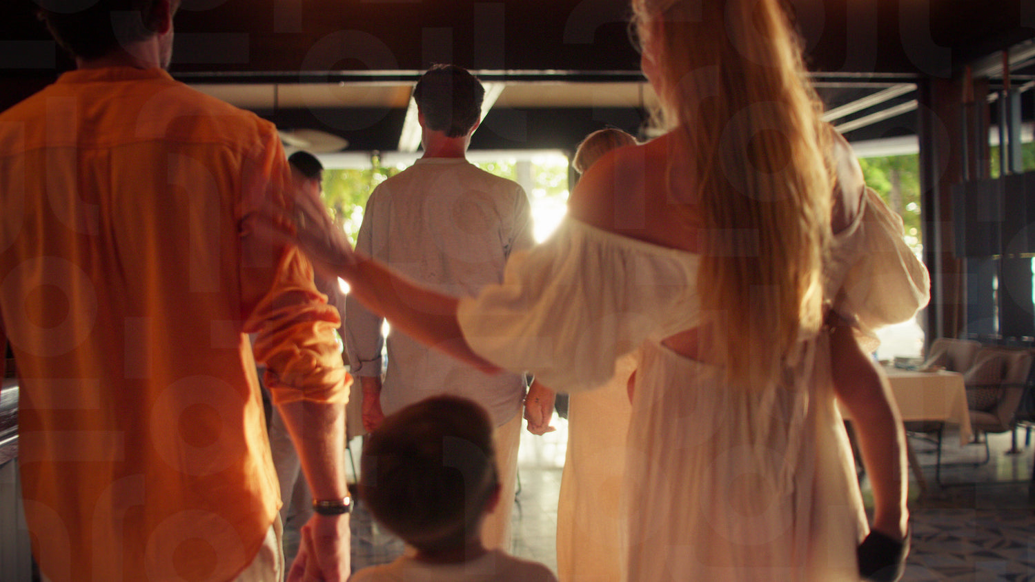 Family walks into a restaurant in a tropical setting. Shows the anticipation and connection of shared moments and the essence of relaxed luxury, togetherness, and memorable dining while on vacation.