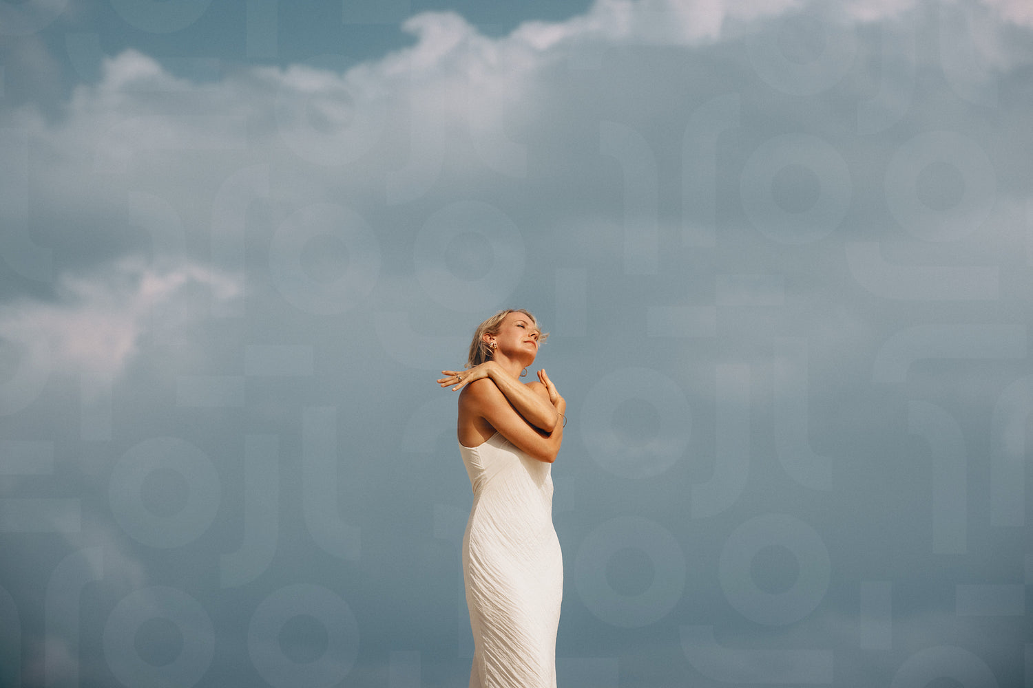 Joyful woman in white dress embracing herself under a moody cloudy sky
