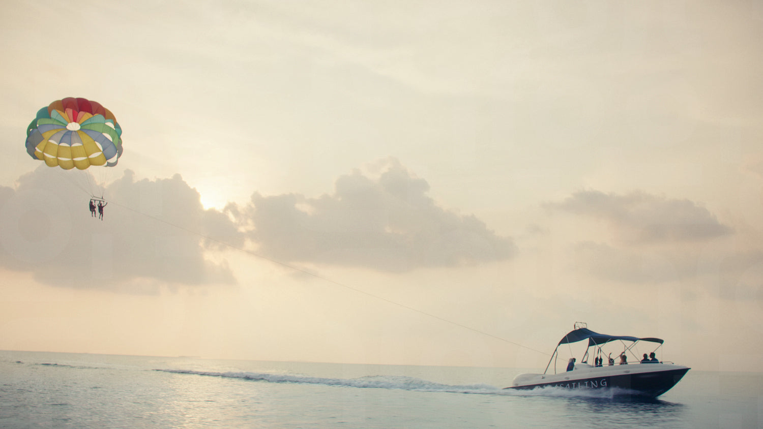 Adventurous people parasail over the stunning ocean during a peaceful sunset. Experience the thrill of flight and breathtaking aerial views on your dream vacation.
