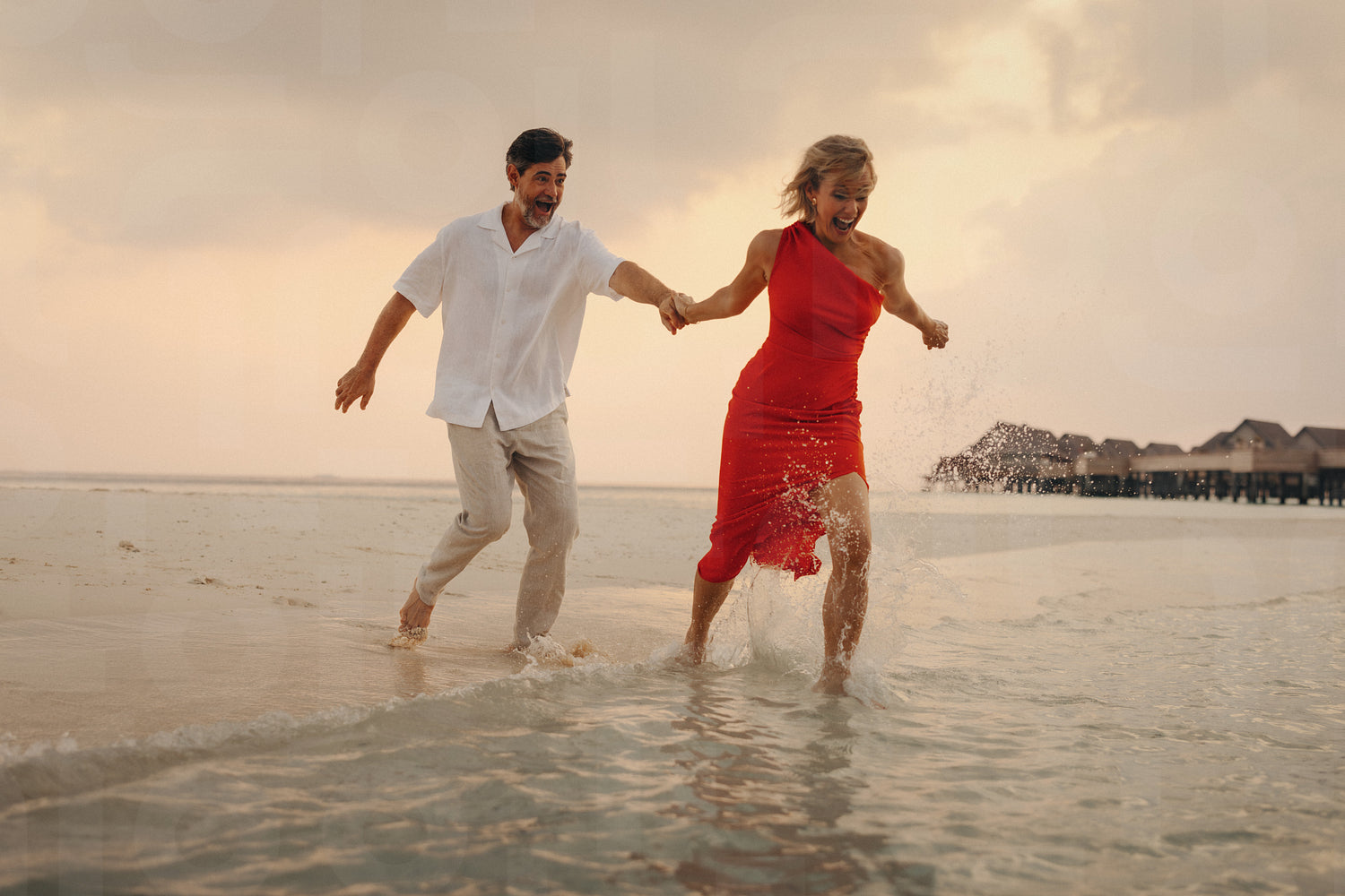 Playful mature couple having fun on the island beach during sunset. Woman in a red gown splashing in the water, enjoying a romantic moment.