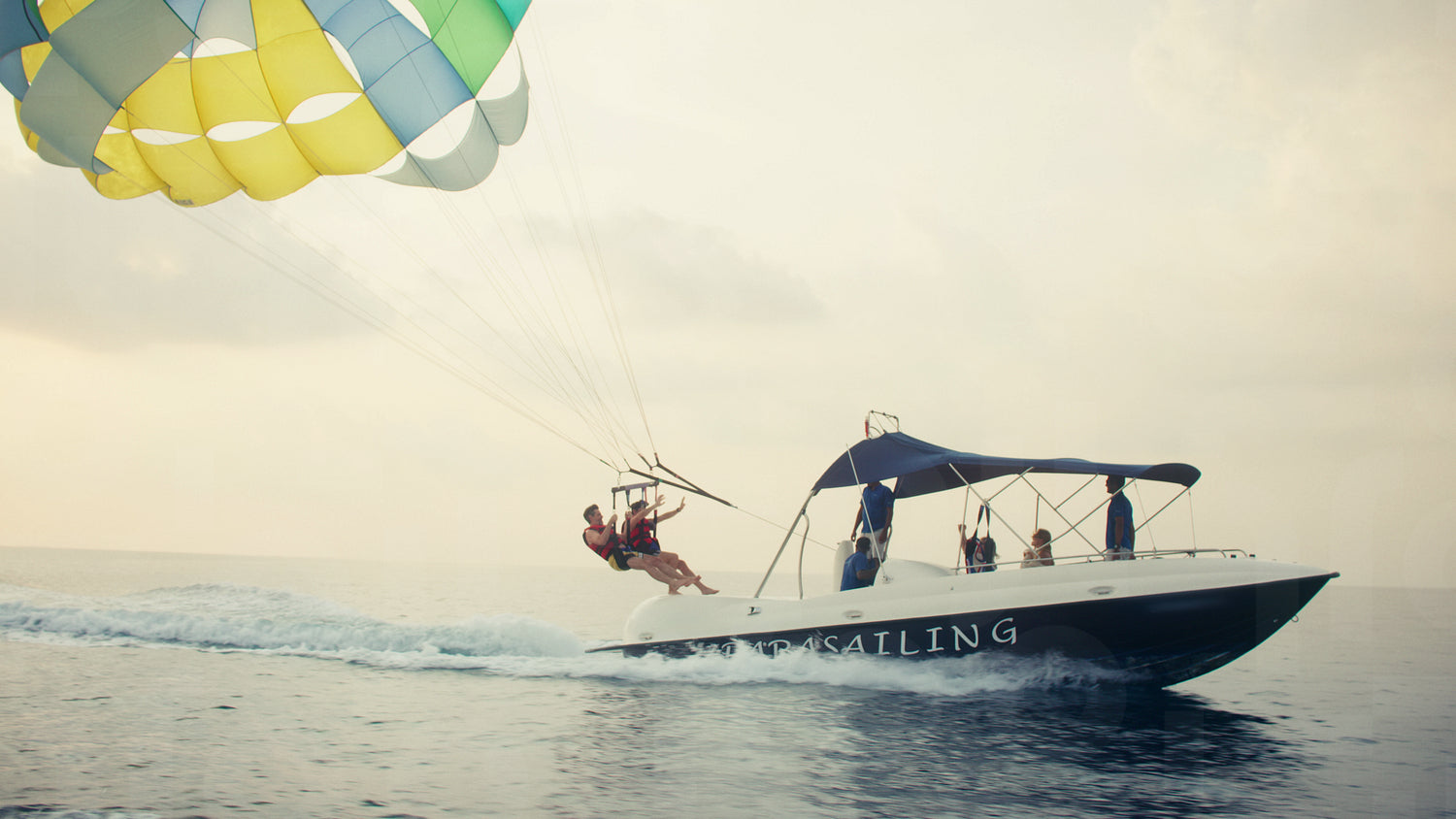 A thrilling parasailing adventure over the open ocean with two people being pulled by a boat. Incredible views and an unforgettable experience for tourists during their holiday.