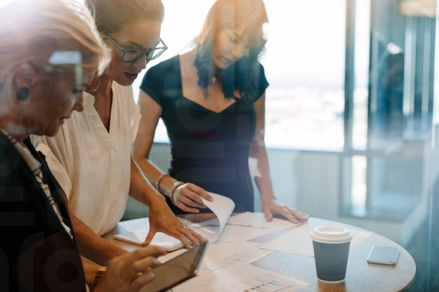 Three female colleagues discussing over documents on table. Team of professionals having a standing meeting around table in office.