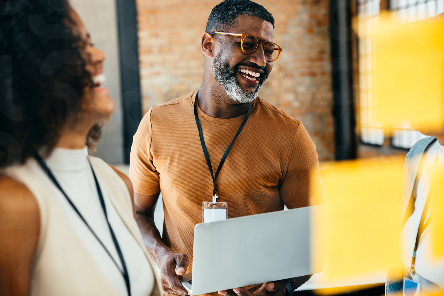 Group of cheerful professionals in a creative office setting, engaged in collaborative work on a digital device, showcasing teamwork and positive energy.
