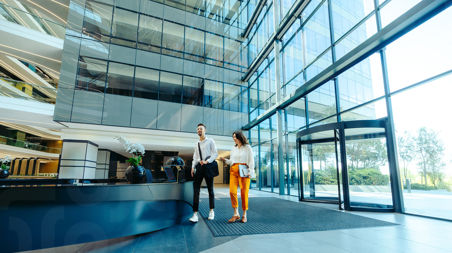 A contemporary office lobby with large glass windows, where two colleagues are walking together. The corporate environment features clean lines, sleek architecture, and dynamic light.