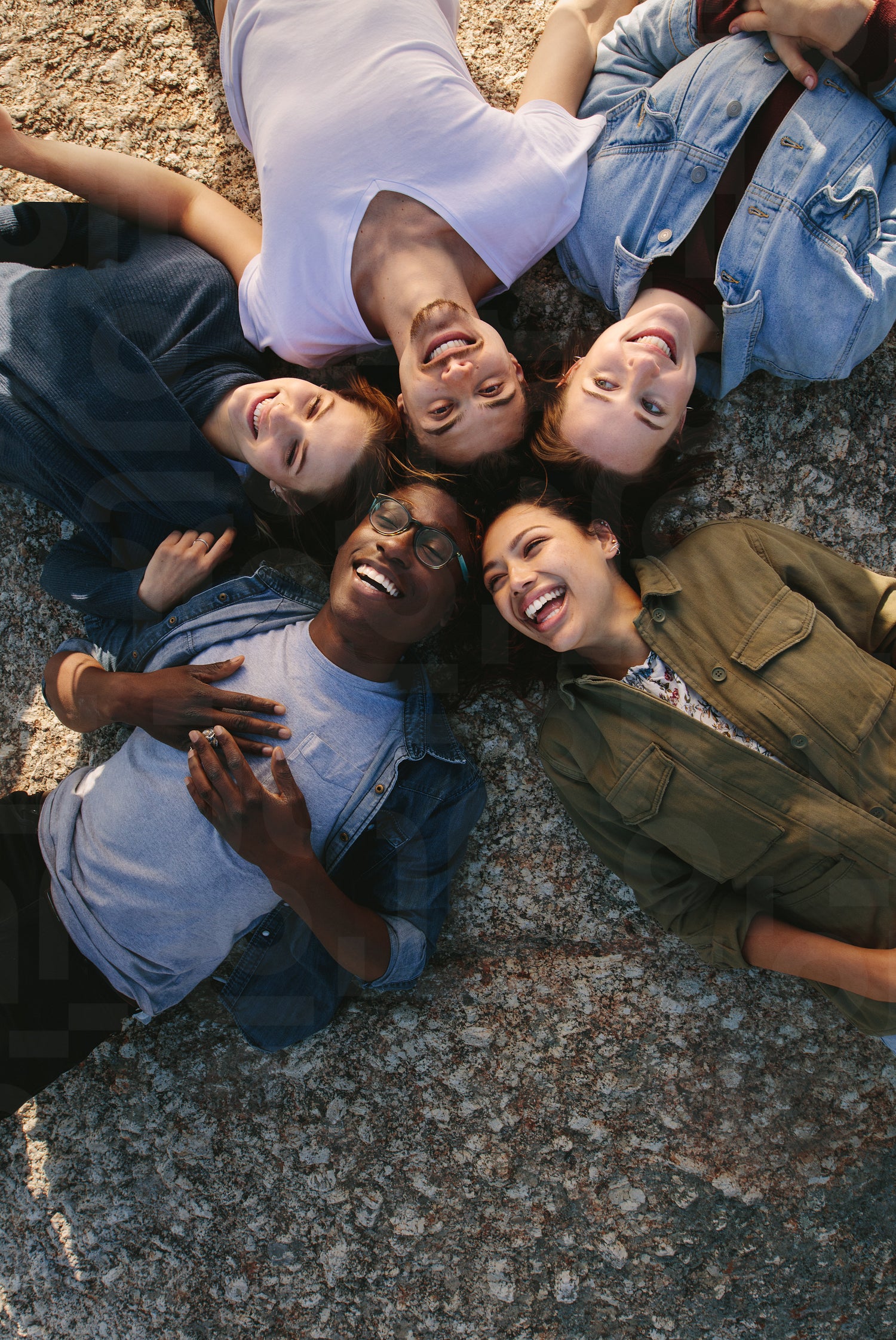 Diverse friends lying on ground in circle outdoors