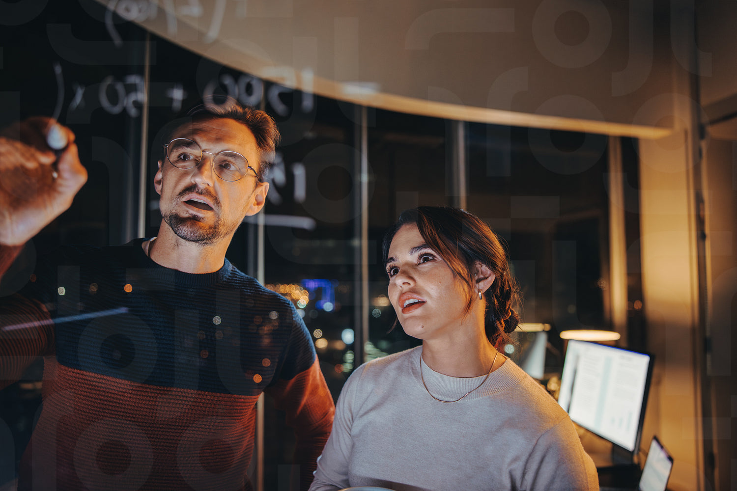 Team of business professionals collaborating in a late-night brainstorming session. Two business people discussing and analysing ideas in a glass-walled office, working towards a project deadline,