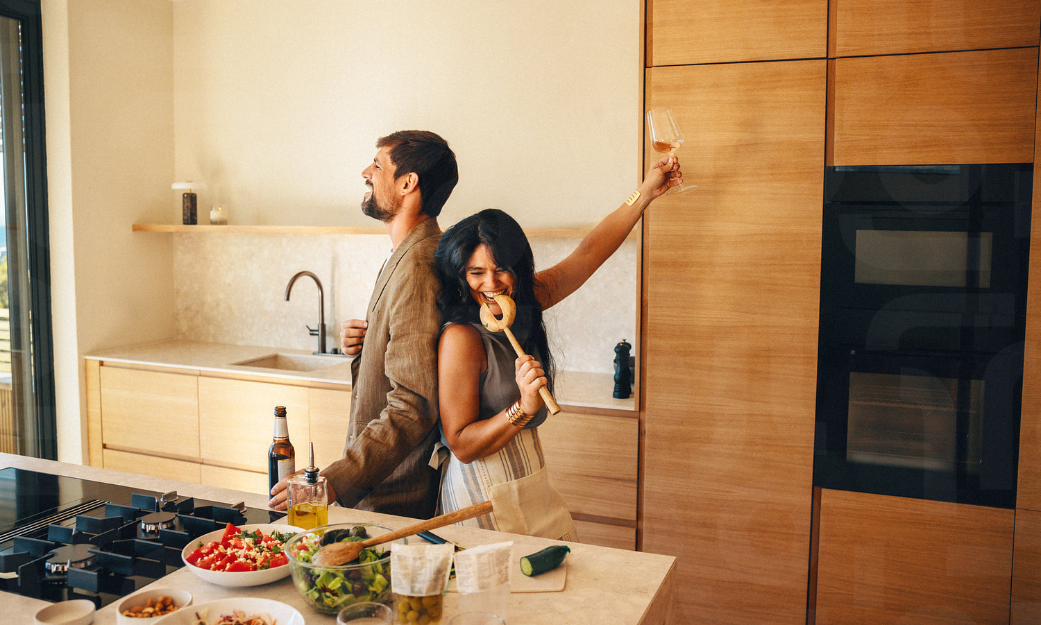 A joyful couple shares a lively moment cooking together in a well-designed kitchen, expressing happiness and connection with laughter, music, and beverages in hand for an enjoyable culinary time.