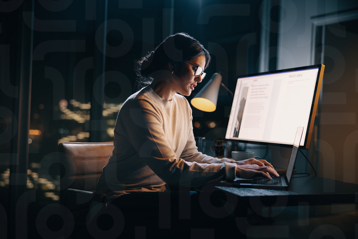 Dedicated caucasian businesswoman working after hours in a dimly lit office. She focuses on her laptop, typing and planning. Determined and professional, she exemplifies work-life balance.