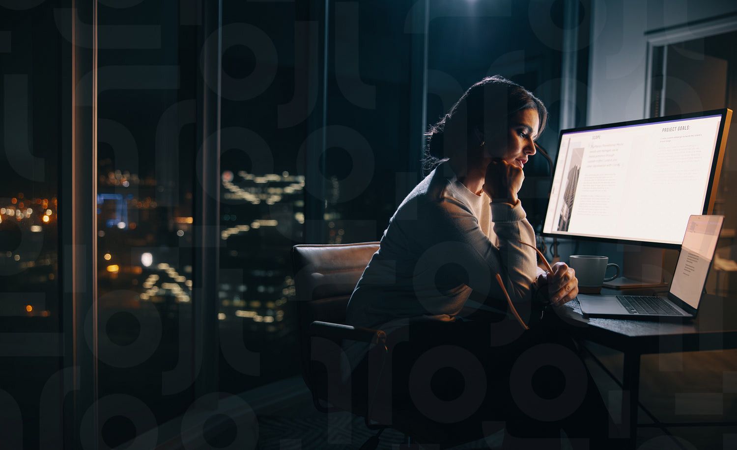 Businesswoman working late in her home office, focusing on a digital marketing project. Woman putting in long hours into her work, sitting with a laptop and a computer screen at her desk.