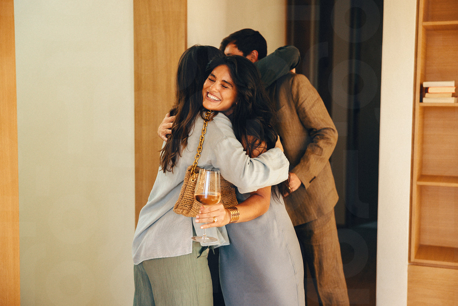 A group of friends warmly embracing during an evening dinner event at a cozy home setting. Feelings of happiness, connection, and hospitality.