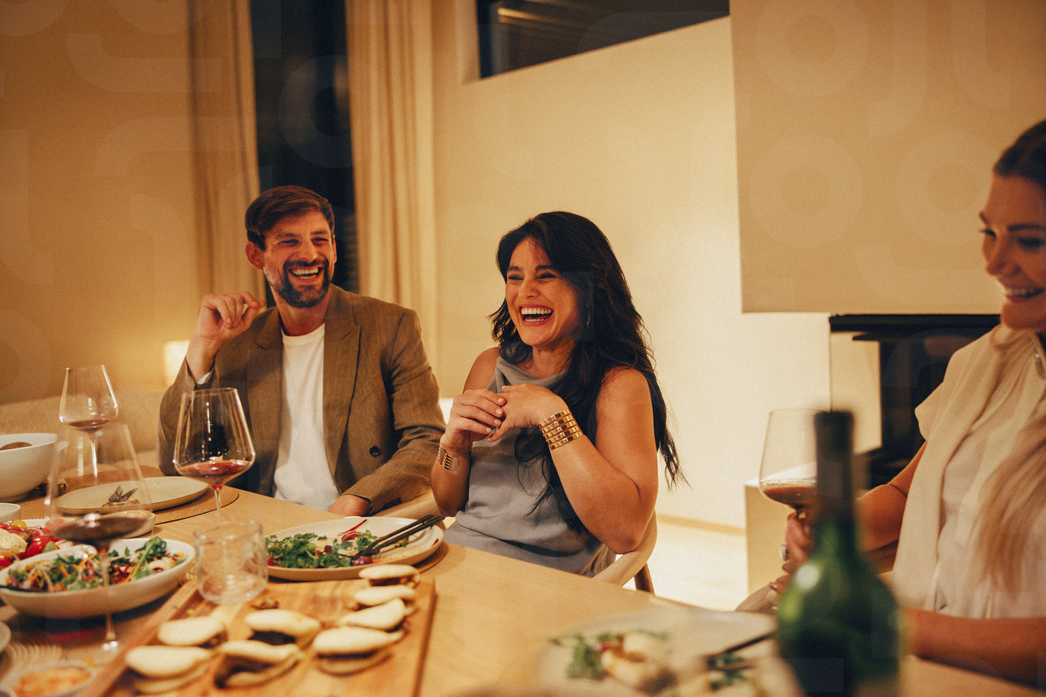 A group of friends enjoying meals and drinks together, sharing laughter and warm conversations. A casual yet intimate indoor moment emphasizing companionship and joy.