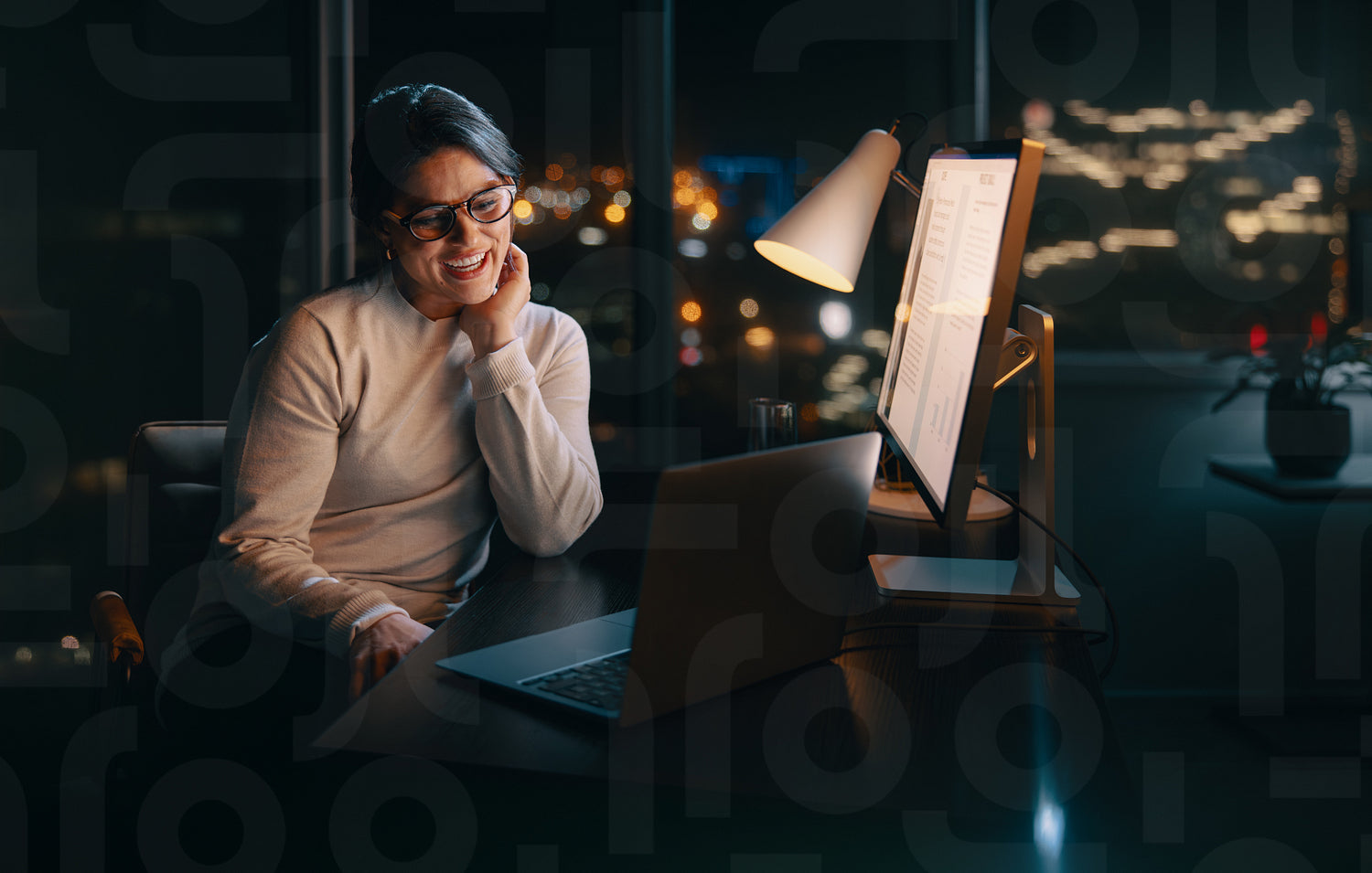Businesswoman sits at her desk, engaged in a virtual meeting after hours in the office. With a laptop, she communicates via video call, exemplifying professionalism and work-life balance.