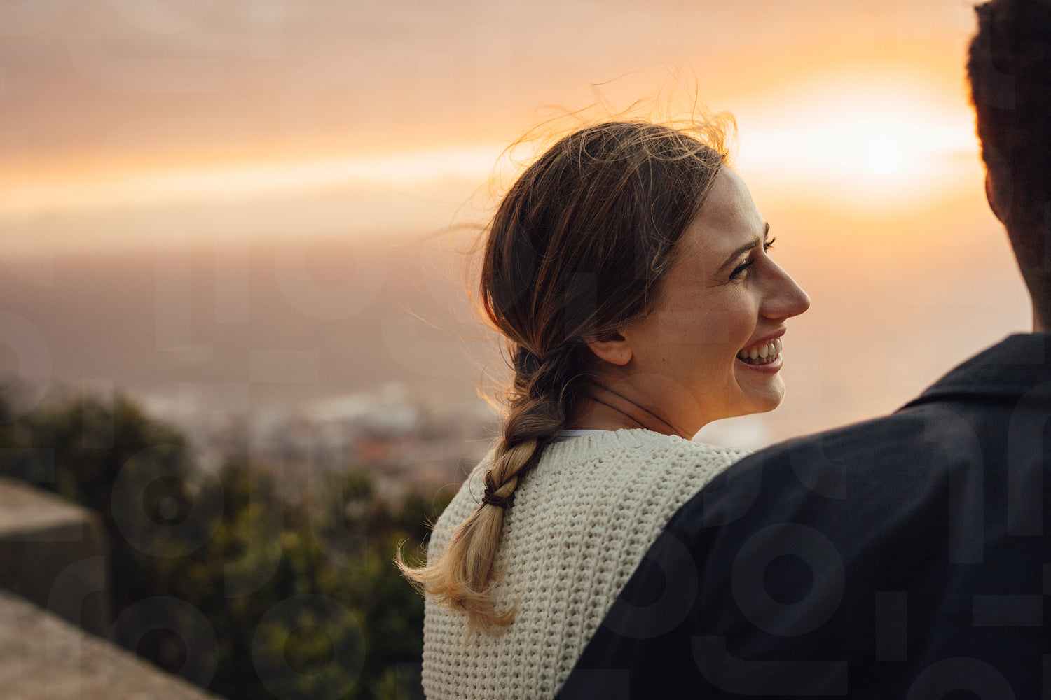 Cheerful young woman sitting with her boyfriend outdoors. Female looking at her man and smiling against sunset.