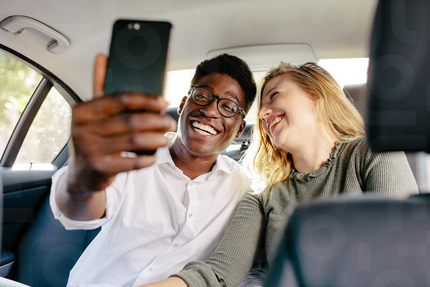 Cheerful interracial couple sitting on back seat of a car and taking selfie with mobile phone. Smiling man with girlfriend taking selfie while traveling by a car.