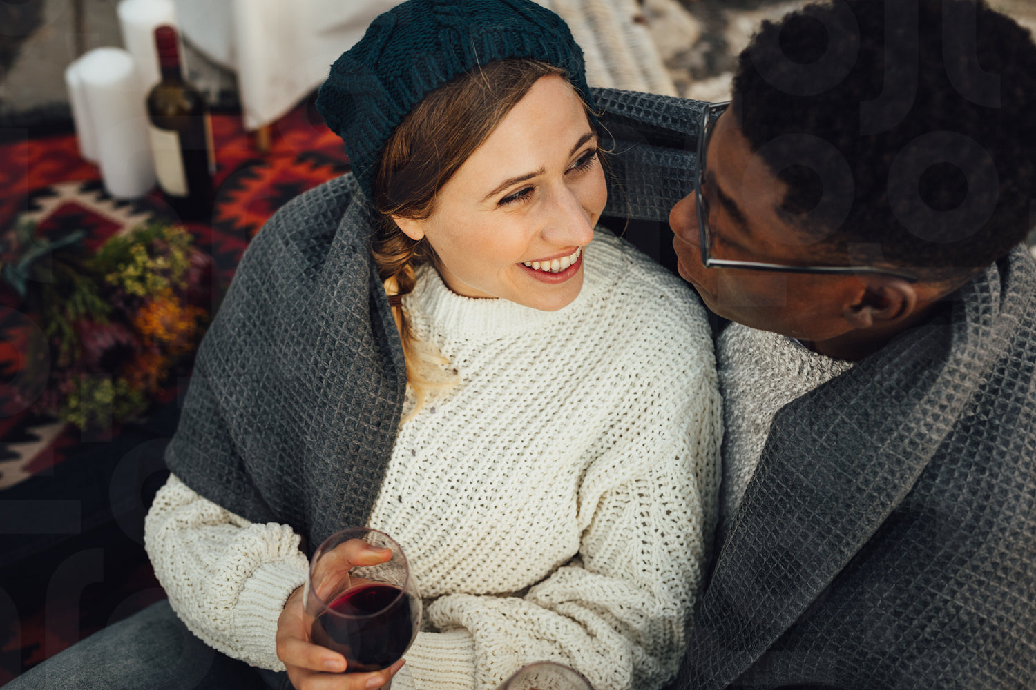 Top view of happy interracial couple sitting together wrapped in blanket with wine. Woman looking at her boyfriend and smiling, both relaxing on a picnic.