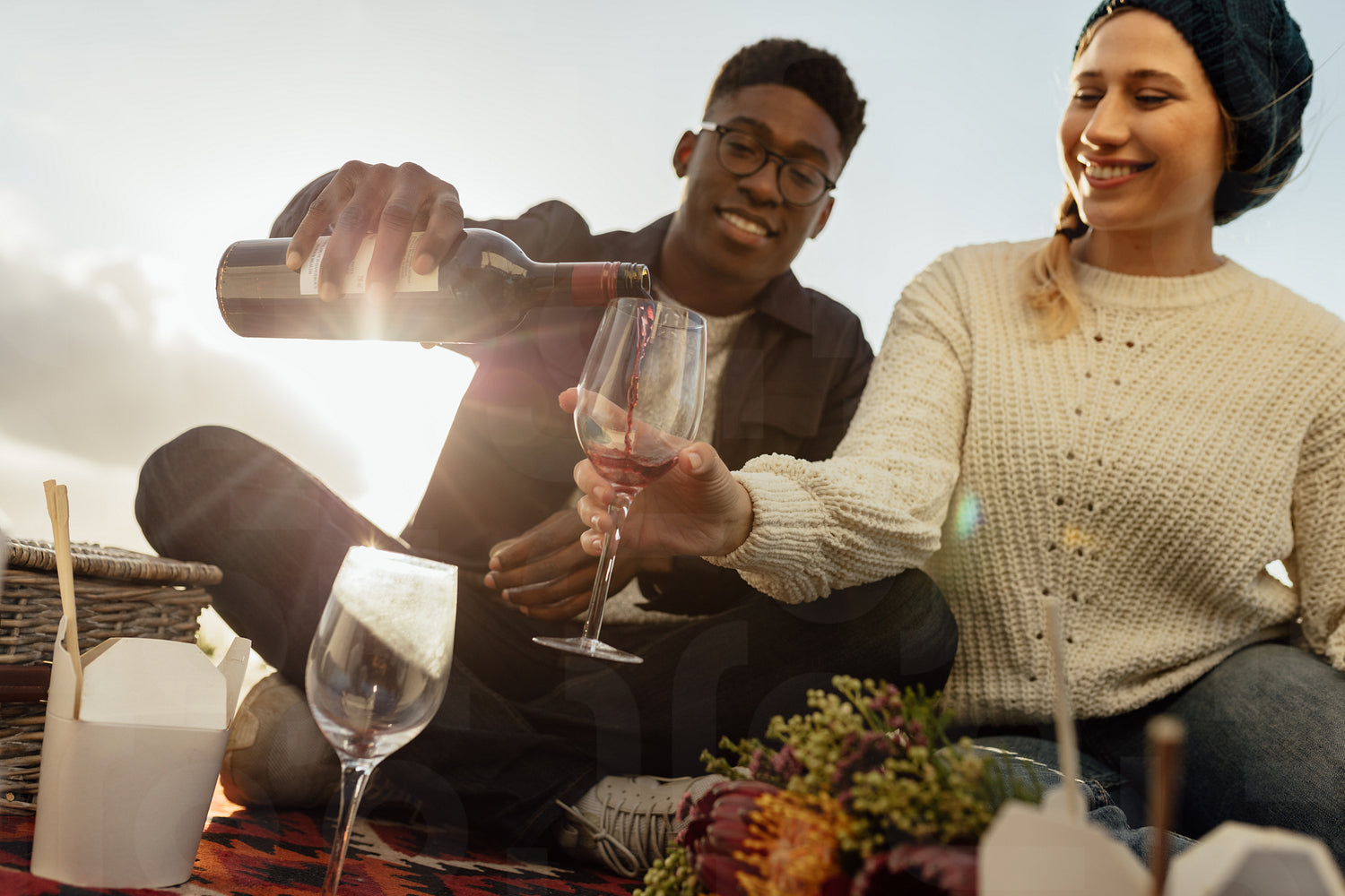 Man serving wine to his girlfriend on picnic. Couple on romantic date drinking wine.