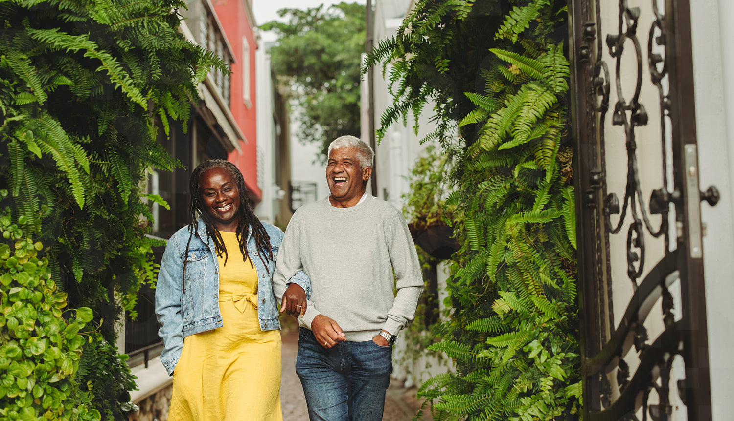 Happy senior couple laughing cheerfully while walking together outdoors. Cheerful senior couple spending some quality time together after retirement.