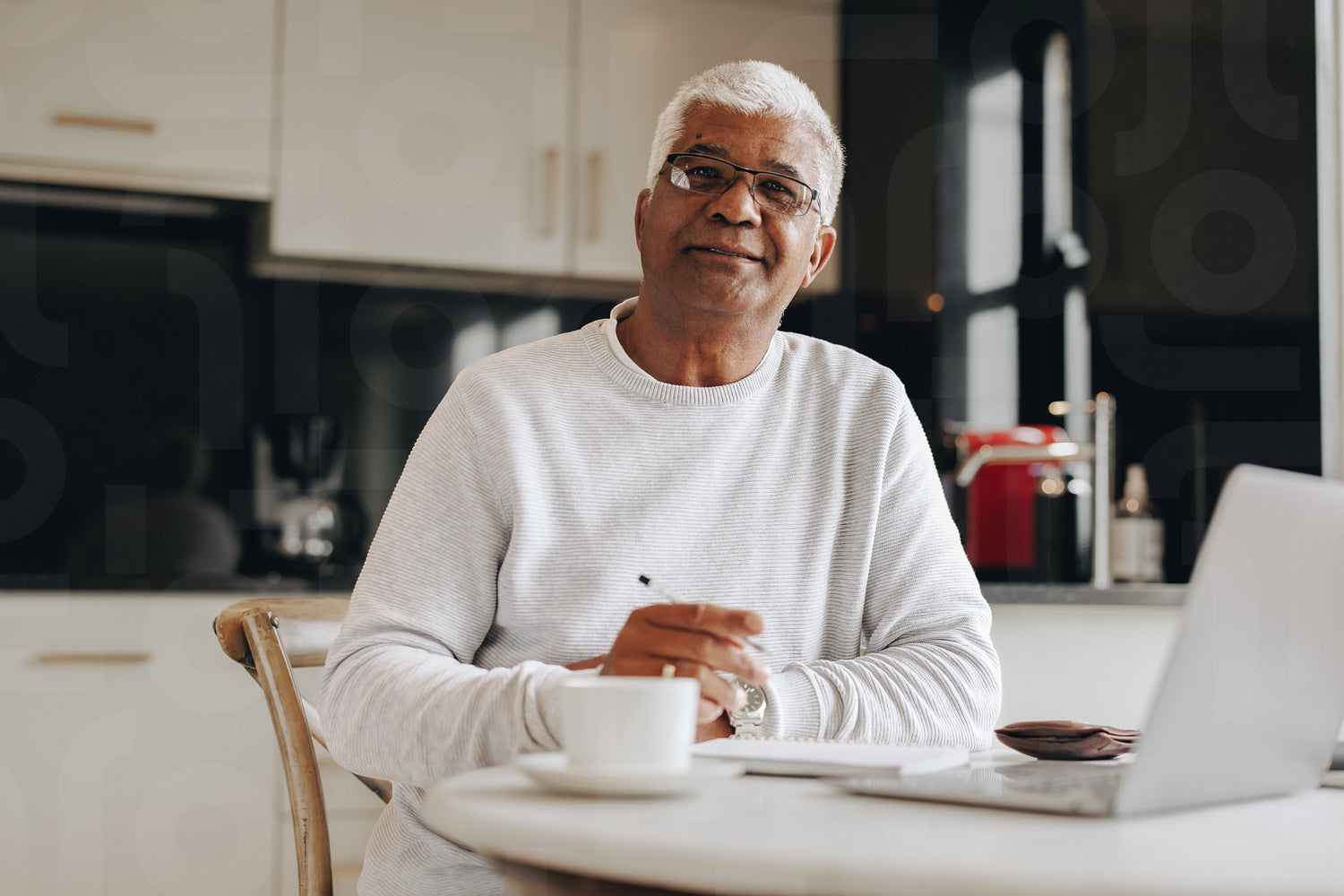 Mature businessman looking at the camera while working from home. Senior businessman using a notebook and a laptop while doing remote freelance work.