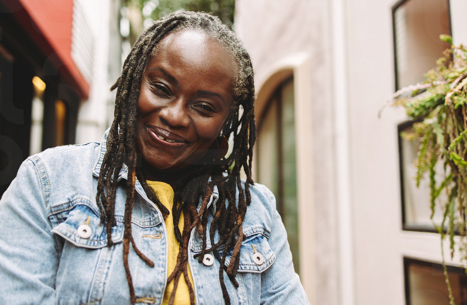 Ethnic woman with dreadlocks smiling happily while standing outdoors. Cheerful senior woman going out in casual clothing.