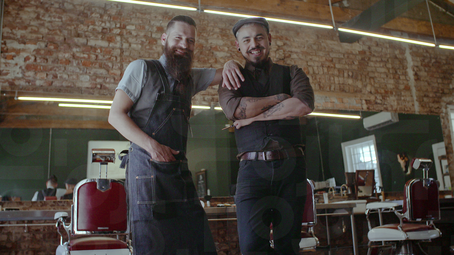 Professional hairdresser with his client standing in barber shop. Barber with satisfied client at salon.