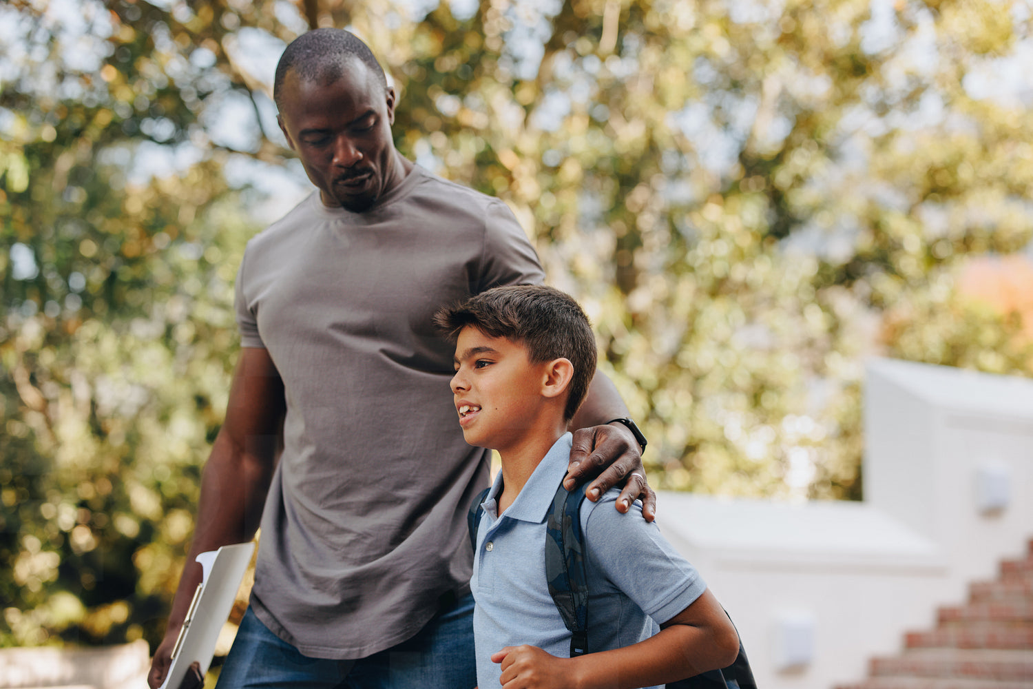 Male teacher walking outdoors with a young student
