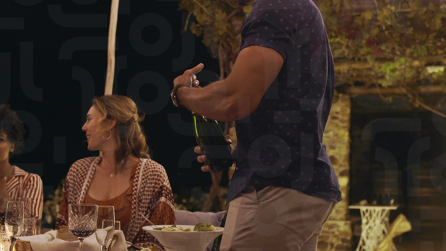 Man opening champagne bottle and serving in glasses with friends sitting around table during party. Young people having drinks at dinner party.